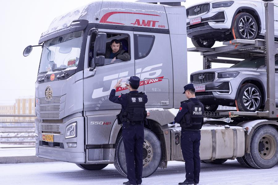 21 февраля 2024 года, сотрудники полиции проверяют паспорт водителя грузовика на КПП Торугарт Синьцзян-Уйгурского автономного района /Северо-Западный Китай/. /Фото: Синьхуа/