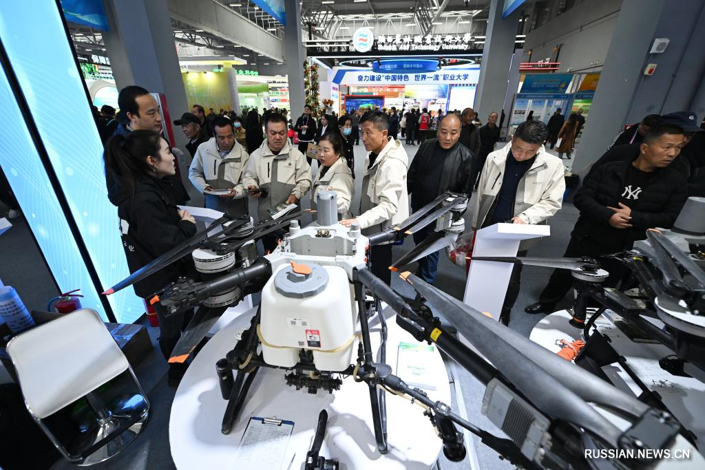 25 октября 2025 года, посетители знакомятся с агродронами на 32-й Китайской /Янлинской/ ярмарке высокотехнологичных достижений в сфере сельского хозяйства в провинции Шэньси /Северо-Западный Китай/. /Фото: Синьхуа/
