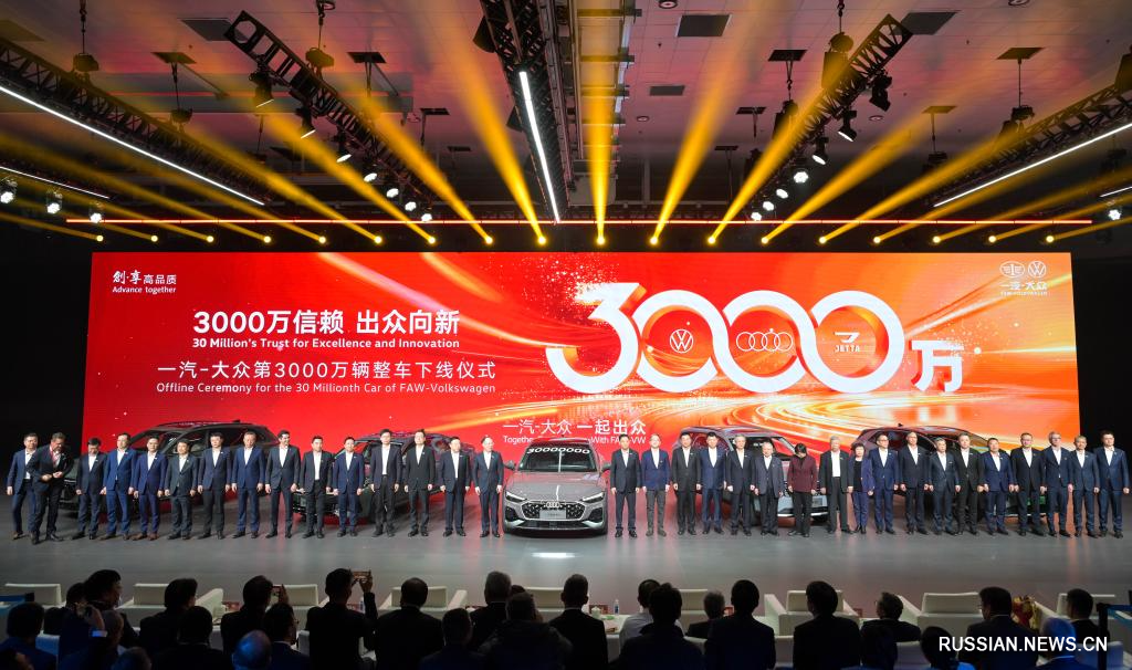 Чанчунь, 31 октября /Синьхуа/ -- В четверг, 30 октября, 30-миллионный автомобиль сошел с конвейера FAW-Volkswagen, совместного предприятия китайской компании FAW /"Первый автомобильный завод"/ и немецкого концерна Volkswagen в Чанчуне /провинция Цзилинь, Северо-Восточный Китай/. Компания FAW-Volkswagen стала первым автопроизводителем в Китае, вышедшей на 30-миллионный рубеж по объемам производства и продаж легковых автомобилей.
