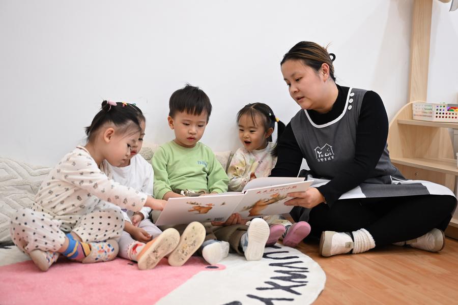 12 декабря 2024 года, воспитательница читает детям книгу с картинками в одном из центров дневного ухода за детьми города Синин провинции Цинхай /Северо-Западный Китай/. /Фото: Синьхуа/