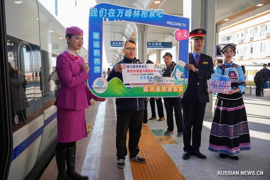 28 ноября 2025 года, пассажир позирует для групповой фотографии с сотрудниками южного вокзала города Синъи провинции Гуйчжоу /Юго-Западный Китай/. /Фото: Синьхуа/