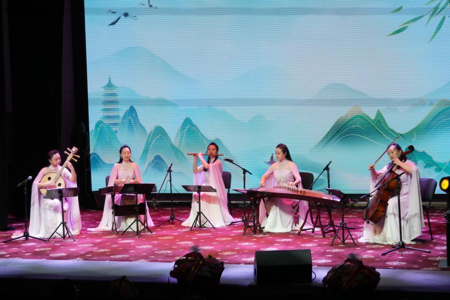 Китайские артисты продемонстрировали коллективную игру на народных музыкальных инструментах, соло на бамбуковой флейте, дуэт на чжунжуане /китайский струнный щипковый музыкальный инструмент/ и янцине /китайский струнный музыкальный инструмент наподобие цимбал/, женское сольное пение и народные танцы.