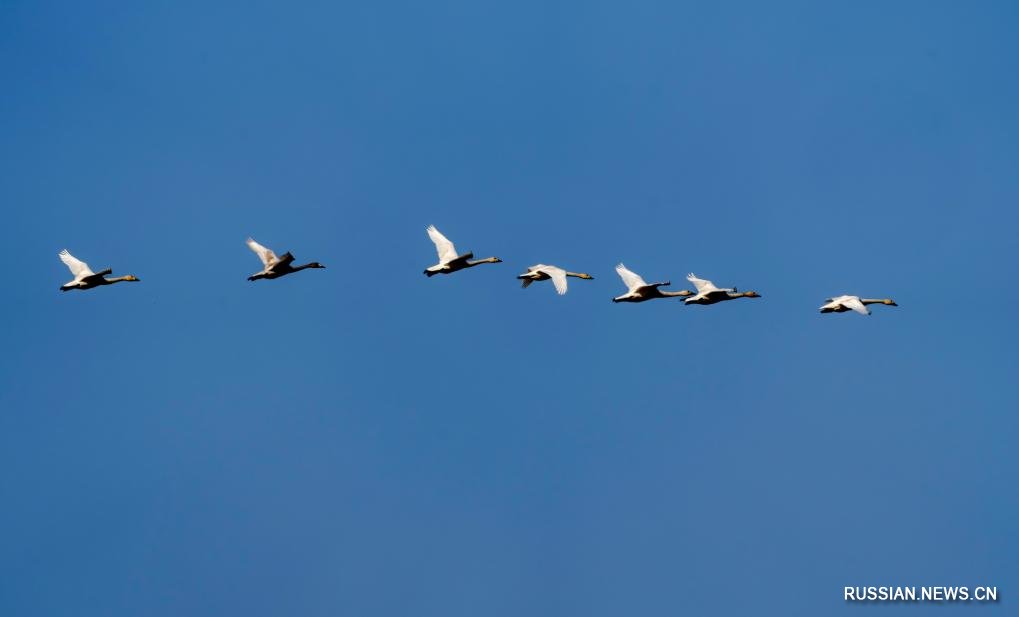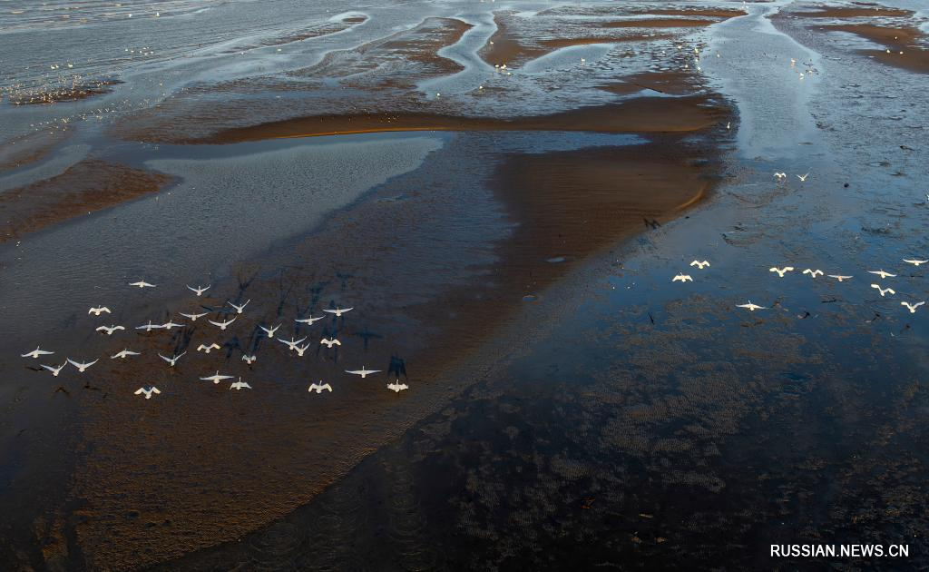 Американские лебеди зимуют на водно-болотных угодьях на востоке Китая