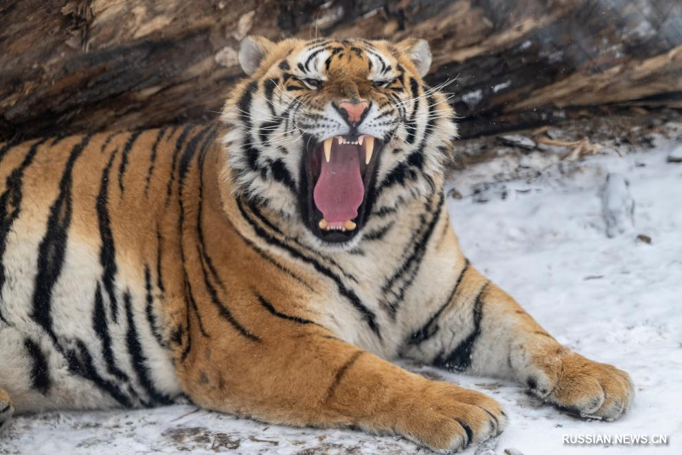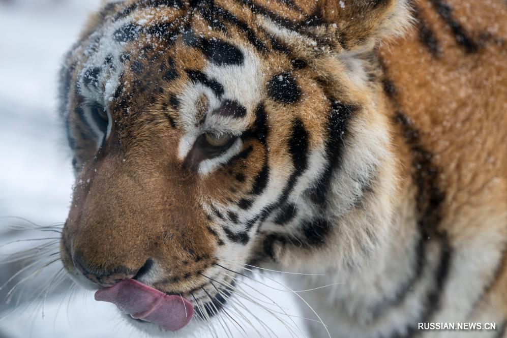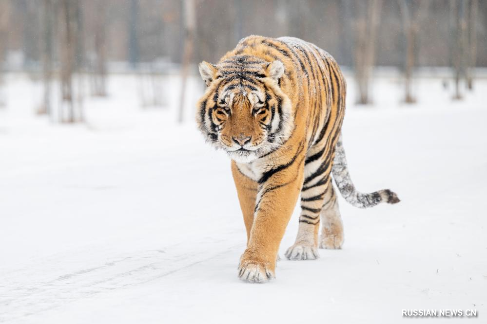 Харбин, 13 января /Синьхуа/ -- В Лесном парке маньчжурских /амурских/ тигров провинции Хэйлунцзян /Северо-Восточный Китай/ полосатые хищники, находящиеся под государственной охраной первой категории в стране, свободно бродят после снегопада.