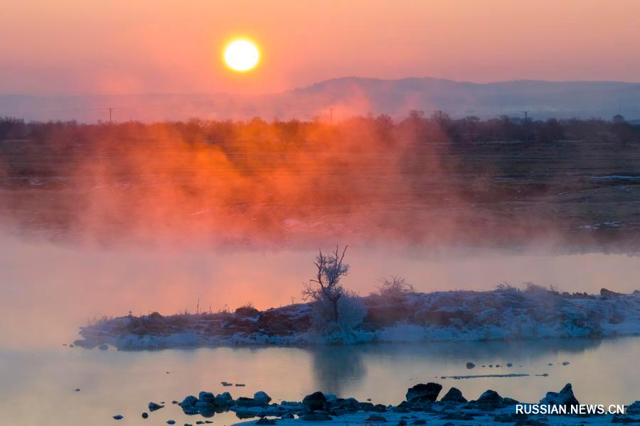12 января 2025 года, восход солнца над озером Цзинбо, которое является мировым геопарком. /Фото: Синьхуа/