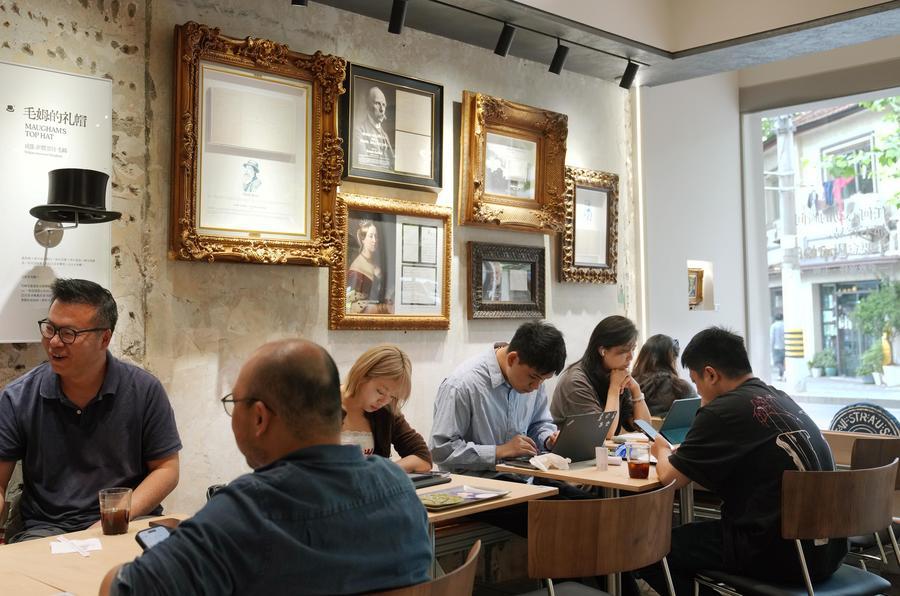 27 апреля 2025 года, на фото запечатлено молодежное кафе "Маому Лимао" /"цилиндр Моэма"/, которое является пространством для чтения, выставок и общения, в районе Сюйхуэй города Шанхай на востоке Китая. /Фото: Синьхуа/