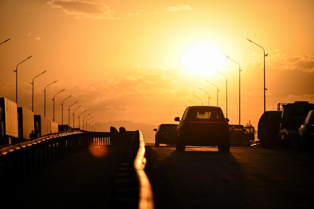22 мая 2025 года. Автомобили на альтернативных источниках энергии китайского производства покидают казахстанский КПП и отправляются на транзитную автостоянку в Жаркенте. /Фото: Синьхуа/