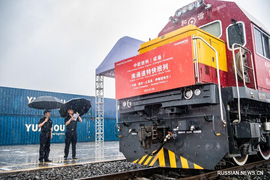 9 июля 2025 года, грузовой поезд Китай-Европа /Чэнду-Чунцин/ ожидает отправления на станции Туаньцзецунь в городе Чунцин /Юго-Западный Китай/. /Фото: Синьхуа/