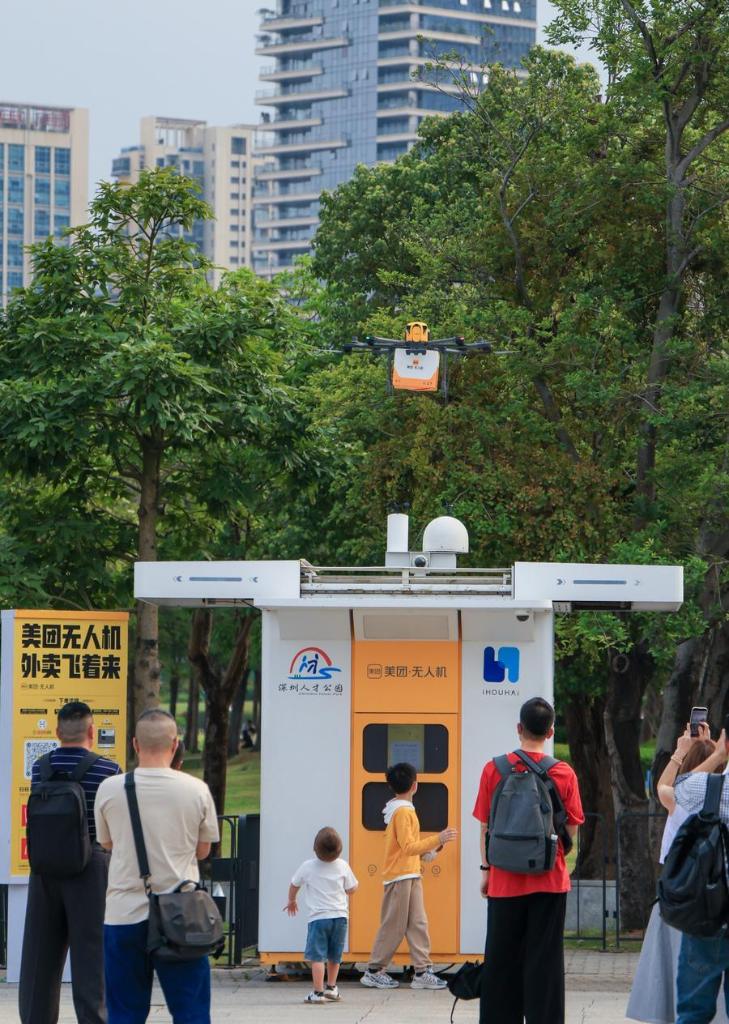 1 апреля 2026 года, туристы снимают на смартфоны, как дрон для доставки еды навынос доставляет заказ на почтомат в одном из парков в городе Шэньчжэнь /пров. Гуандун, Южный Китай/. /Фото: Синьхуа/