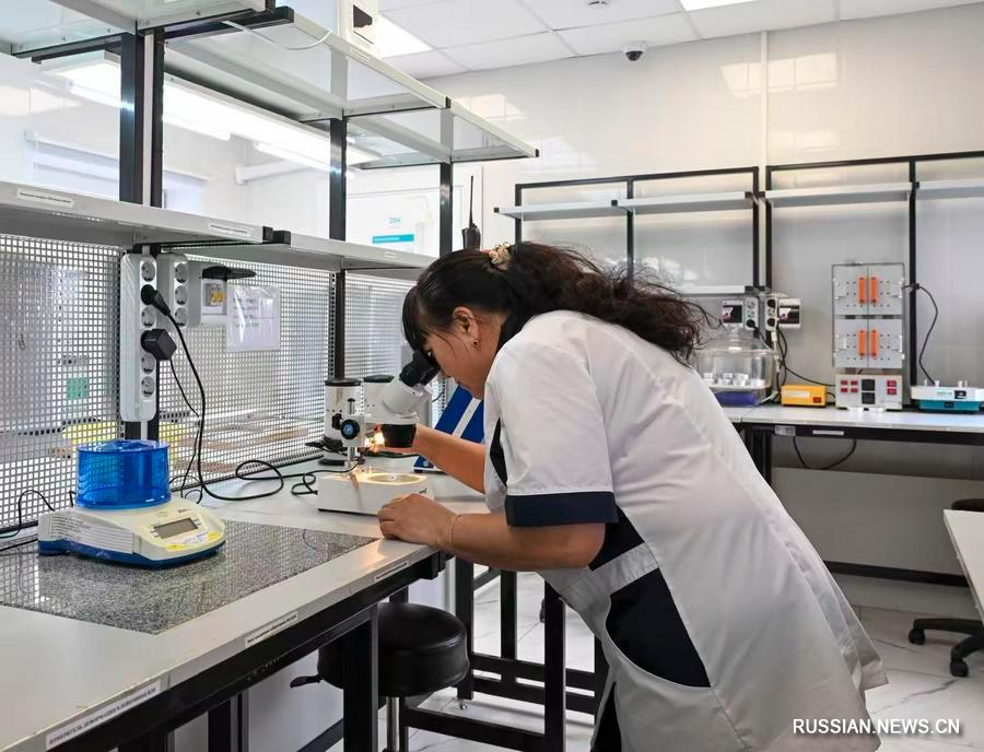 22 апреля, Забайкальск, Россия. Сотрудница лаборатории Забайкальского зернового терминала проверяет качество зерна. /Фото: Синьхуа/