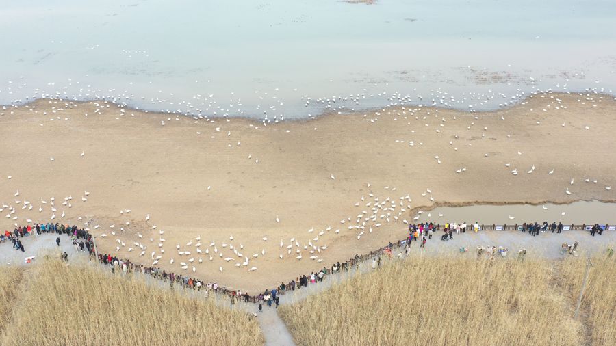 Белые лебеди прилетели зимовать на водно-болотные угодья китайского города Саньмэнься