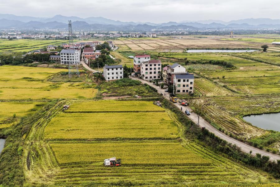 22 октября, Цзиньхуа, Китай. Зерноуборочные комбайны ведут уборку урожая риса-сырца в демонстрационной зоне высококачественных сельскохозяйственных угодий в поселке Танъя района городского подчинения Цзиньдун города Цзиньхуа в провинции Чжэцзян /Восточный Китай/. /Фото: Синьхуа/