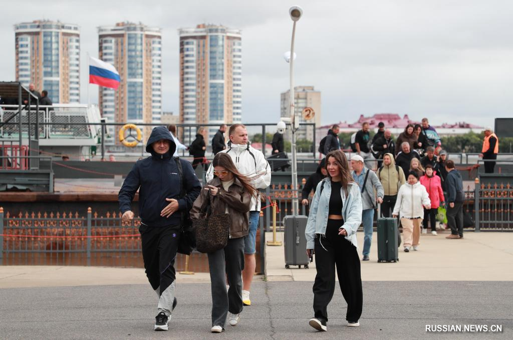 15 сентября 2025 года, на снимке запечатлена группа туристов, прибывших из России в Китай по безвизу через водный КПП Хэйхэ провинции Хэйлунцзян /Северо-Восточный Китай/. /Фото: Синьхуа/
