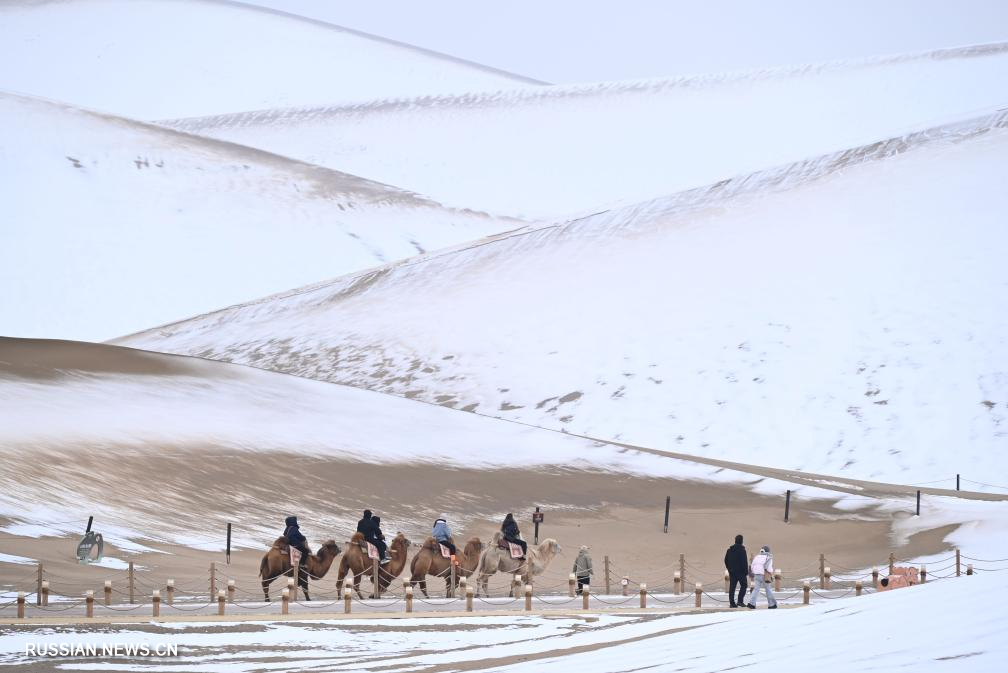 Дуньхуан, 24 ноября /Синьхуа/ -- 23 ноября под влиянием холодных воздушных масс в городе Дуньхуан провинции Ганьсу /Северо-Западный Китай/ выпал снег. Знаменитые местные достопримечательности, такие как гора Миншашань и озеро Юэяцюань, облачились в серебряный наряд и выглядят невероятно красиво.