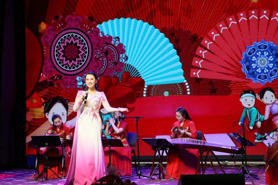 Китайские артисты продемонстрировали коллективную игру на народных музыкальных инструментах, соло на бамбуковой флейте, дуэт на чжунжуане /китайский струнный щипковый музыкальный инструмент/ и янцине /китайский струнный музыкальный инструмент наподобие цимбал/, женское сольное пение и народные танцы.