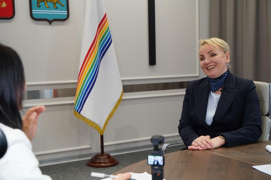8 декабря, Биробиджан, Россия. Губернатор Еврейской автономной области РФ Мария Костюк дает интервью корр. Синьхуа. /Фото: Синьхуа/