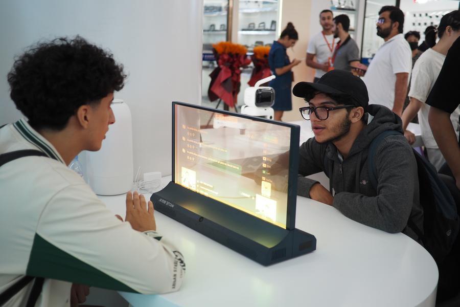 14 октября 2025 года, иностранные посетители Иуского глобального центра цифровой торговли в городе Иу провинции Чжэцзян /Восточный Китай/ знакомятся с интерактивным экраном для перевода на основе ИИ. /Фото: Синьхуа/