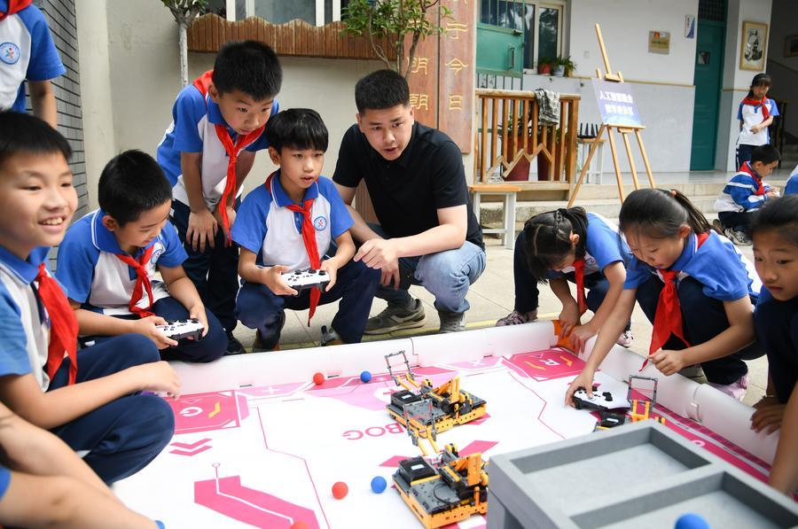 26 мая 2025 года, ученики одной из начальных школ города Сиань /адм. центр пров. Шэньси, Северо-Западный Китай/ управляют робототехническими устройствами под руководством учителя. /Фото: Синьхуа/