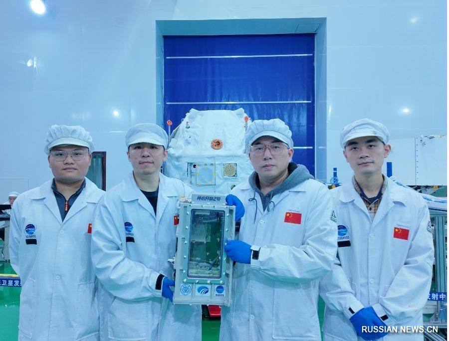 2 декабря 2025 года, исследователи позируют для фотографии с небольшой экспериментальной полезной нагрузкой космической экосистемы на космодроме Цзюцюань на северо-западе Китая. /Фото: Синьхуа/