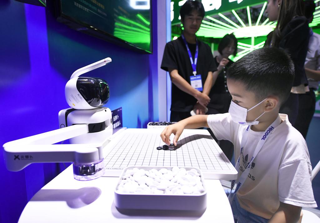 24 августа 2024 года, мальчик играет в шахматы с роботом в выставочной зоне Глобального саммита предпринимателей HICOOL-2024. /Фото: Синьхуа/