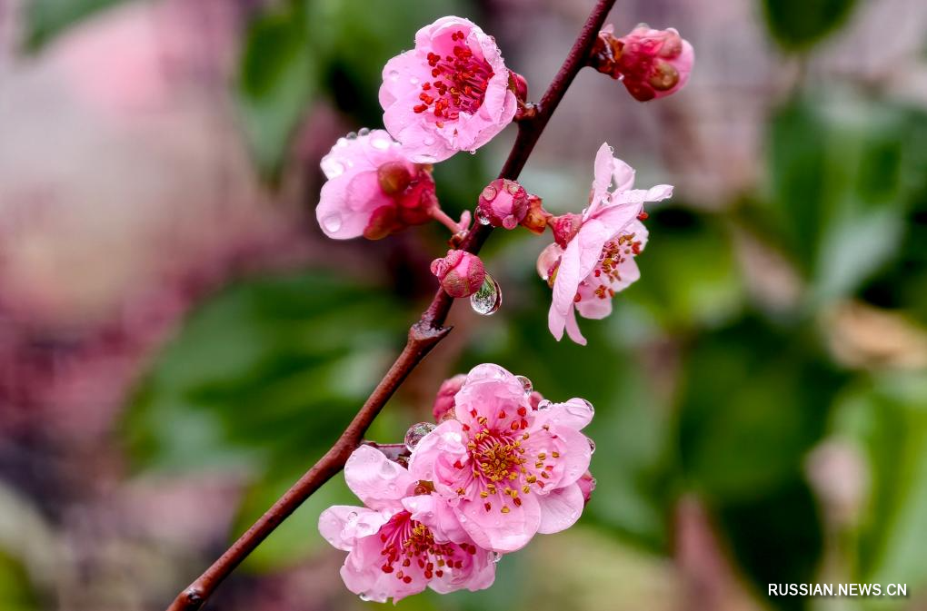 Пекин, 2 марта /Синьхуа/ -- На снимке: цветы в капельках весенних дождей формируют живописные пейзажи в Китае.
