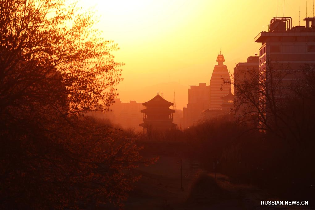 Пекин, 19 марта /Синьхуа/ -- На фото от 18 марта запечатлен закат в Парке руин городской стены династии Мин в Пекине.