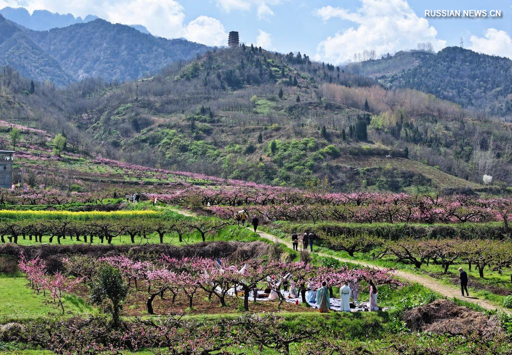 Сиань, 1 апреля /Синьхуа/ -- В настоящее время в районе Чанъань города Сиань /пров. Шэньси, Северо-Западный Китай/, расположенном у подножия горы Чжуннань в горной цепи Циньлин, цветут персиковые сады площадью более 6 800 му /примерно 447 га/. Различные культурно-туристические мероприятия, такие как поэтический салон в честь цветения персика, привлекают множество туристов, чтобы насладиться яркими весенними пейзажами.