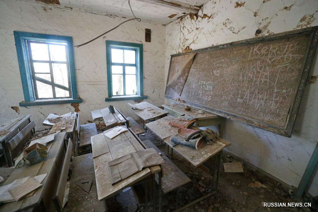"Это школа, и сюда часто приходят туристы, чтобы сделать фото. Здесь время остановилось 40 лет назад", -- говорит сопровождающий корреспондентов, заведующий отделом информационного обеспечения ПГРЭЗ Алексей Казаков. После аварии на Чернобыльской АЭС советское правительство провело экстренную эвакуацию населенных пунктов в 30-километровой зоне вокруг станции, и деревня Дроньки, где находится эта школа, тоже попала в их число.