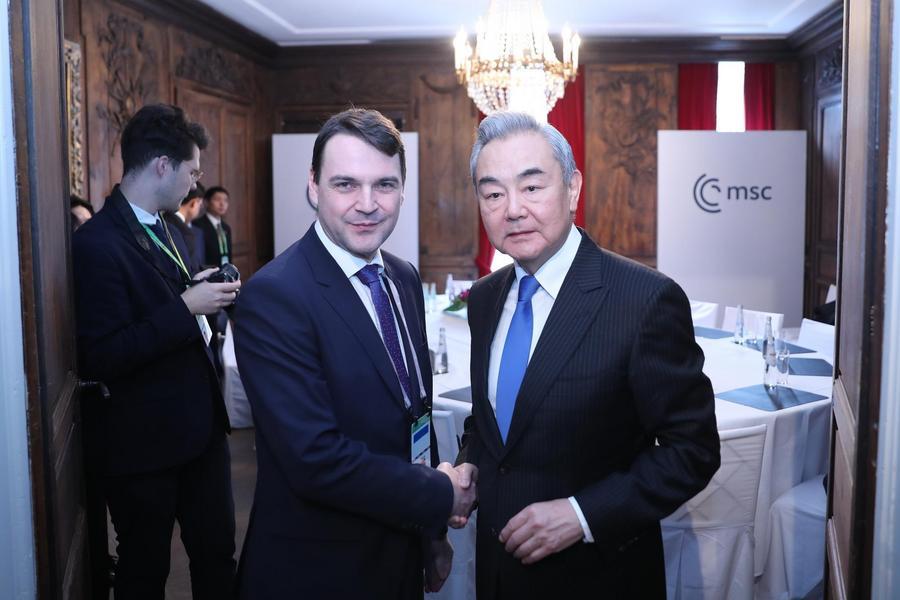 14 февраля, Мюнхен, Германия. Член Политбюро ЦК КПК, министр иностранных дел Китая Ван И встречается с заместителем премьер-министра и министром иностранных дел Чехии Петром Мацинкой по просьбе последнего в кулуарах проходящей Мюнхенской конференции по безопасности. /Фото: Синьхуа/
