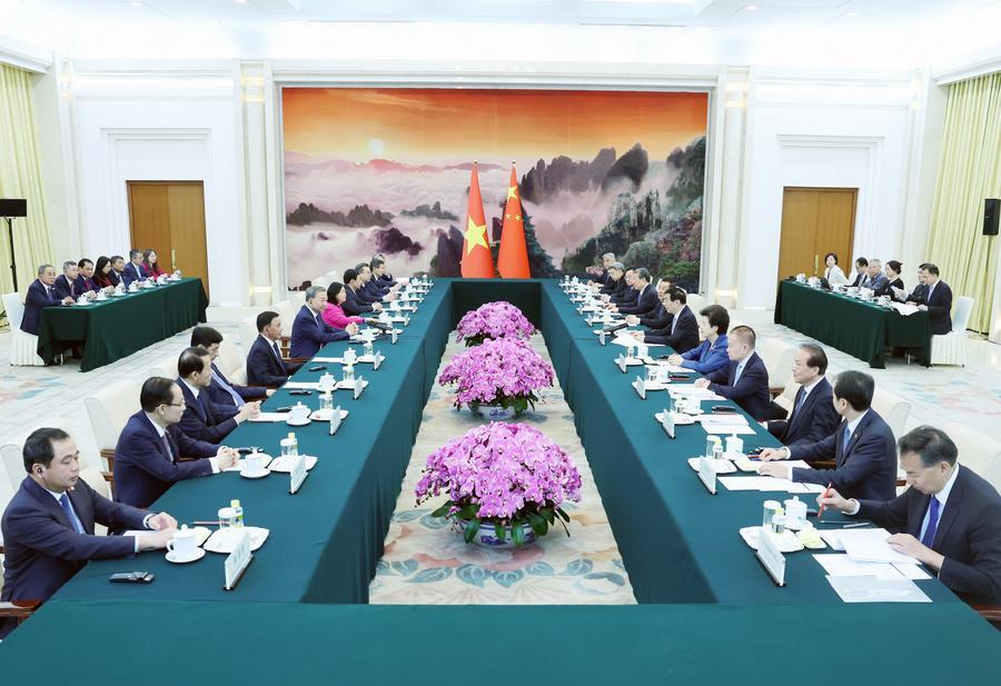 14 апреля, Пекин. Член Постоянного комитета Политбюро ЦК КПК, председатель ВК НПКСК Ван Хунин проводит встречу с генеральным секретарем ЦК Коммунистической партии Вьетнама, президентом Вьетнама То Ламом. /Фото: Синьхуа/